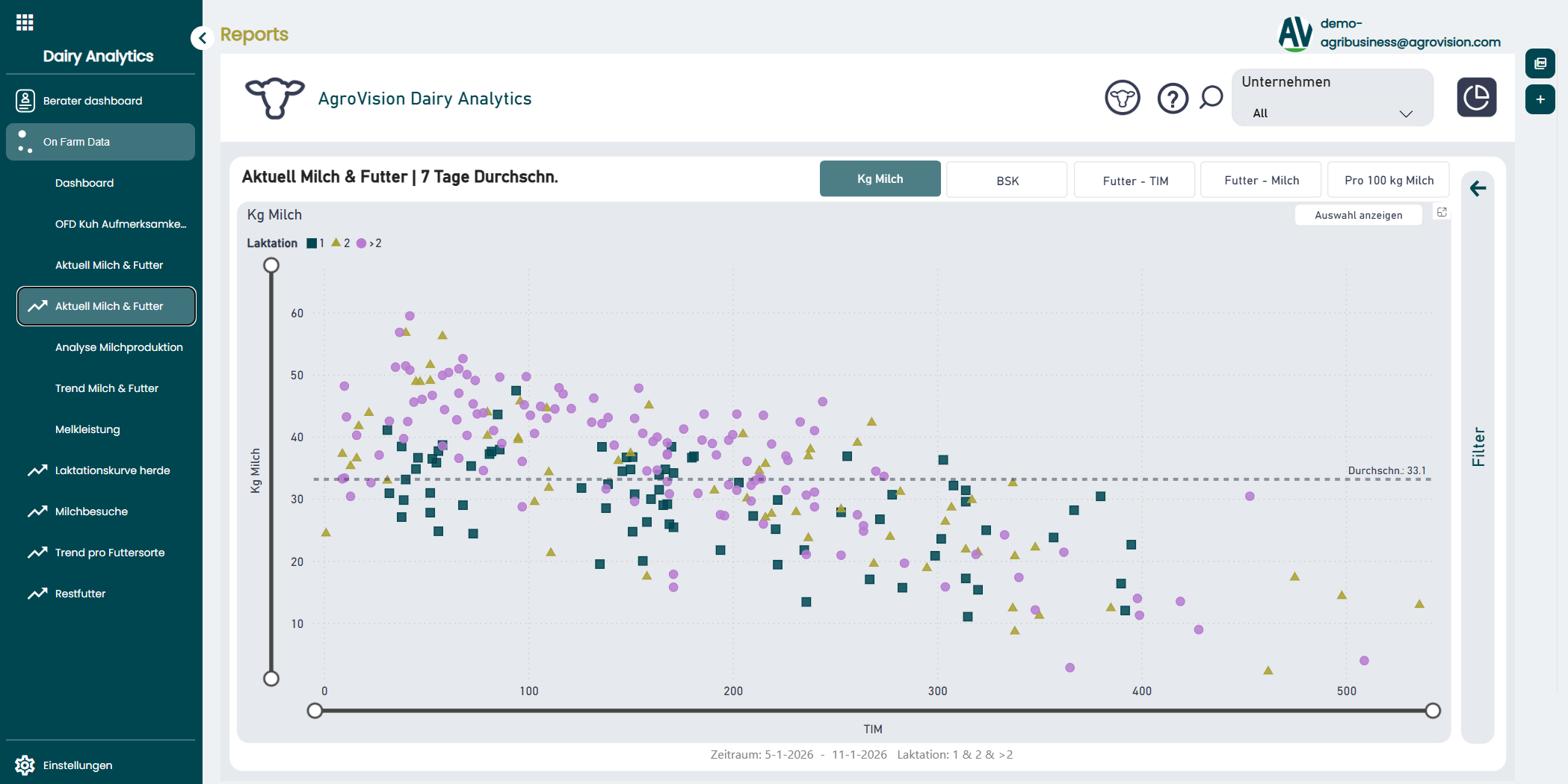 Als Berater für Milchkühe können Sie in AgroVision Dairy Analytics dank aktueller Daten schnell den Zusammenhang zwischen Futteraufnahme und Milchproduktion erkennen. Innerhalb von 24 Stunden nach der Rationsanpassung wird der mögliche Effekt der Beratung im Programm sichtbar.