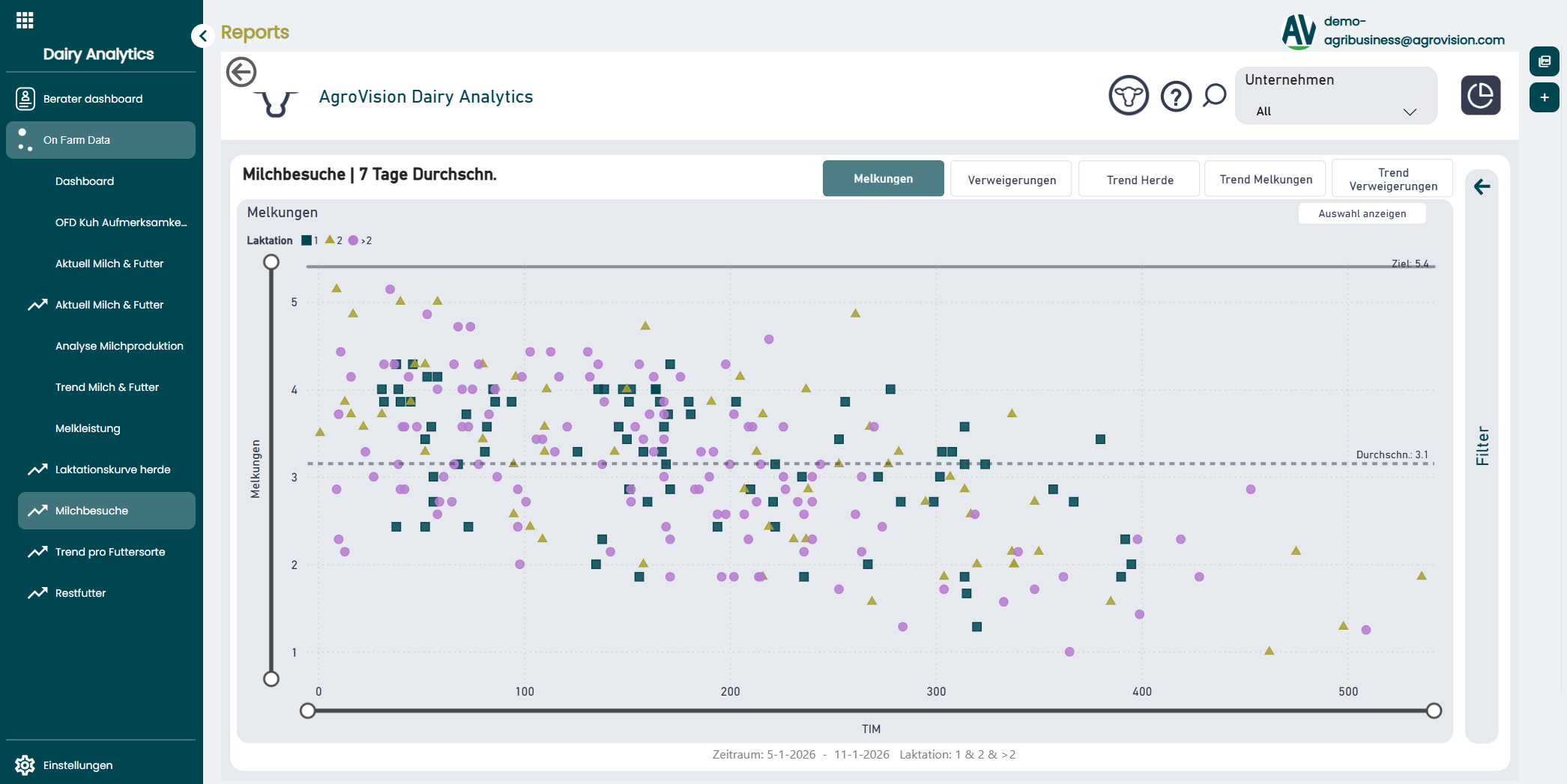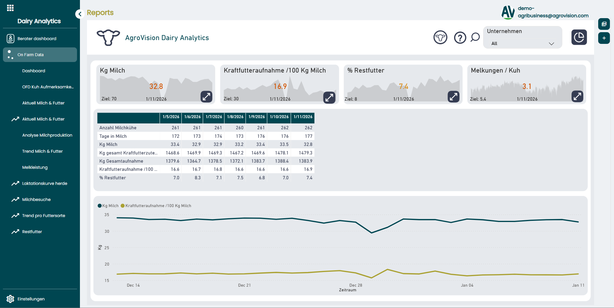 AgroVision Dairy Analytics wurde speziell für Berater der Milchviehhaltung entwickelt. Das Programm ermöglicht es dem Milchviehberater, alle relevanten Daten aller Kunden auf einen Blick zu sehen. Die Software bündelt Futter-, Melk- und Roboterdaten aller Marken und fast aller Systeme. Sie stellt die gesammelten Daten in übersichtlichen Analysen und Tabellen dar. Das spart Zeit. Diese verbleibende Zeit kann für die eigentliche Arbeit, die Beratung der Kunden, genutzt werden.