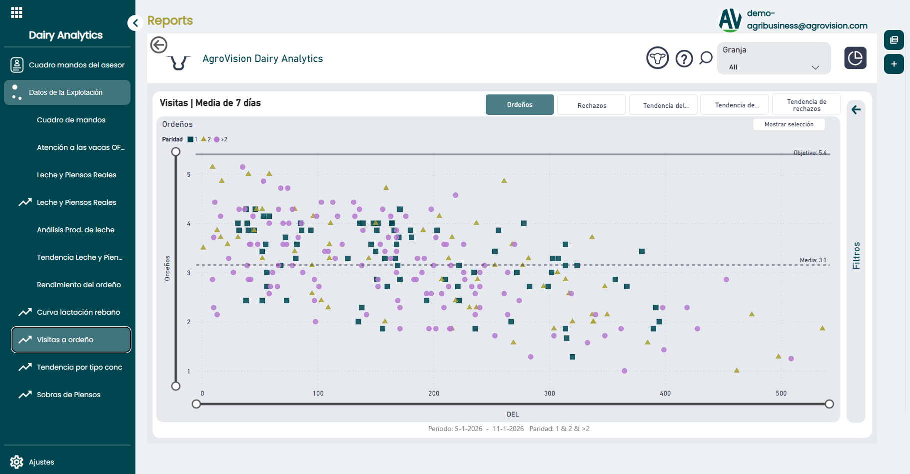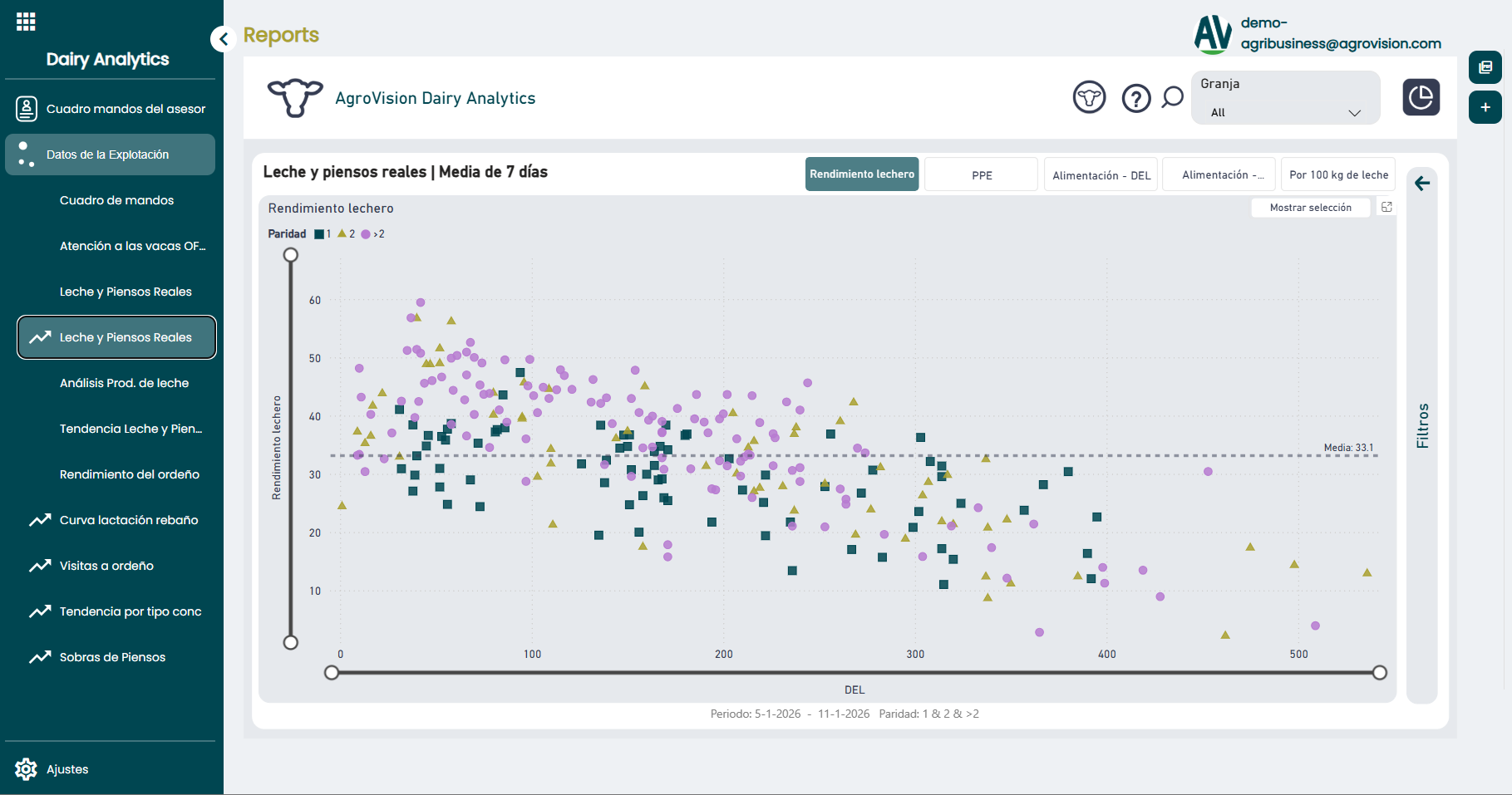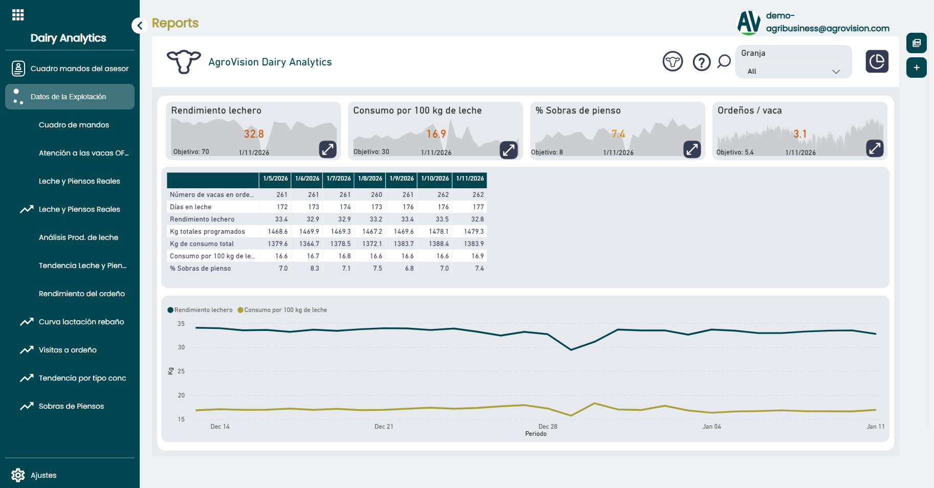 Dairy Analytics está especialmente diseñado para asesores de ganado lechero. El programa permite al asesor de ganado lechero ver de un vistazo todos los datos relevantes de todos los clientes. El software agrupa datos de alimentación, ordeño y robots procedentes de todas las marcas y casi todos los sistemas. A continuación, presenta los datos recopilados en análisis y tablas claros. Esto ahorra tiempo. Este tiempo restante puede emplearse en el verdadero trabajo: asesorar a los clientes.